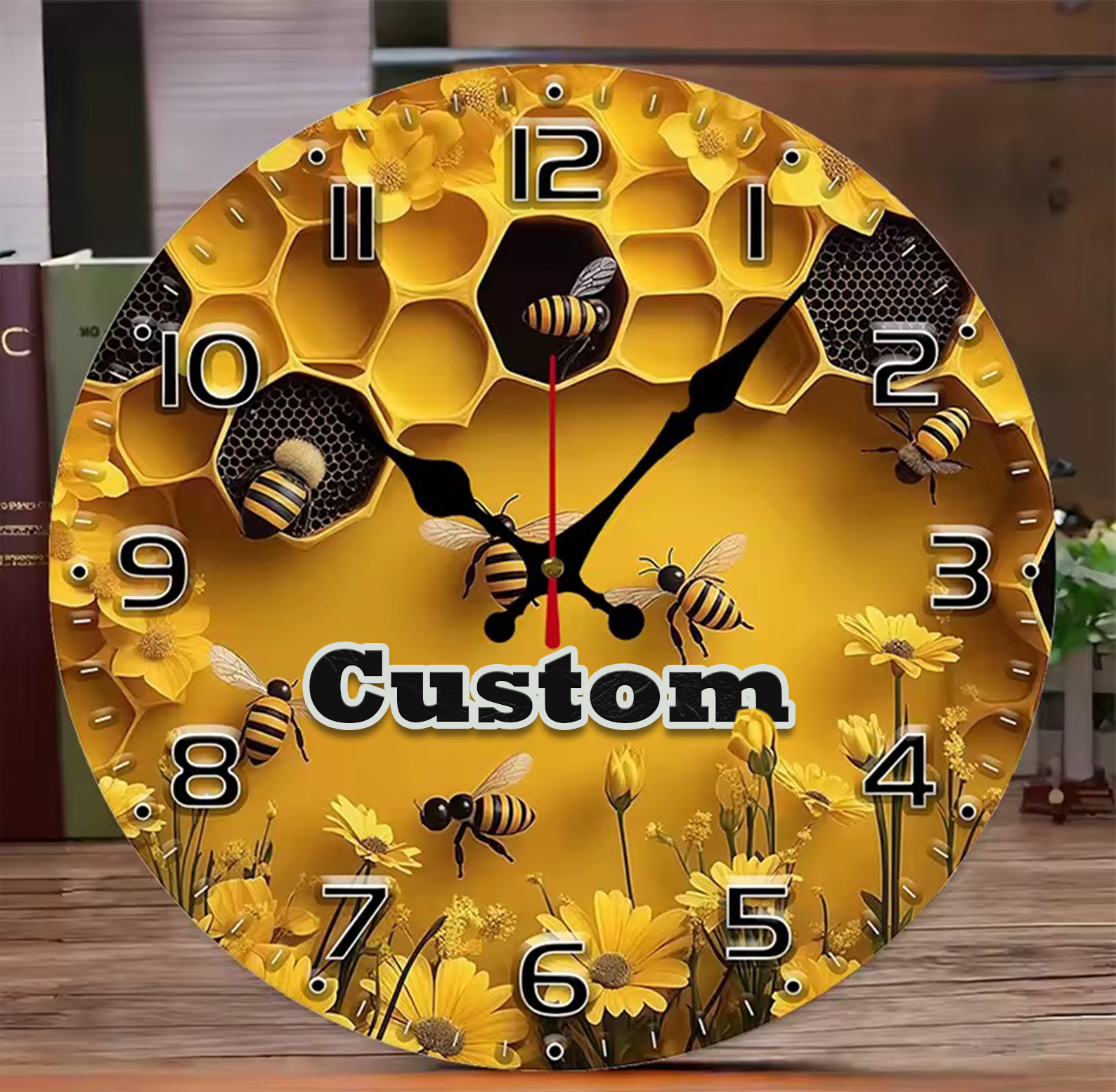 Crafted from high-quality MDF, this round wall clock is lightweight yet durable, offering a smooth surface and detailed printed artwork. The honeycomb design and bee illustration create a warm, organic aesthetic while maintaining a clean and modern look. Although the surface is flat, the high-resolution print gives depth and texture, enhancing the visual appeal without adding bulk.