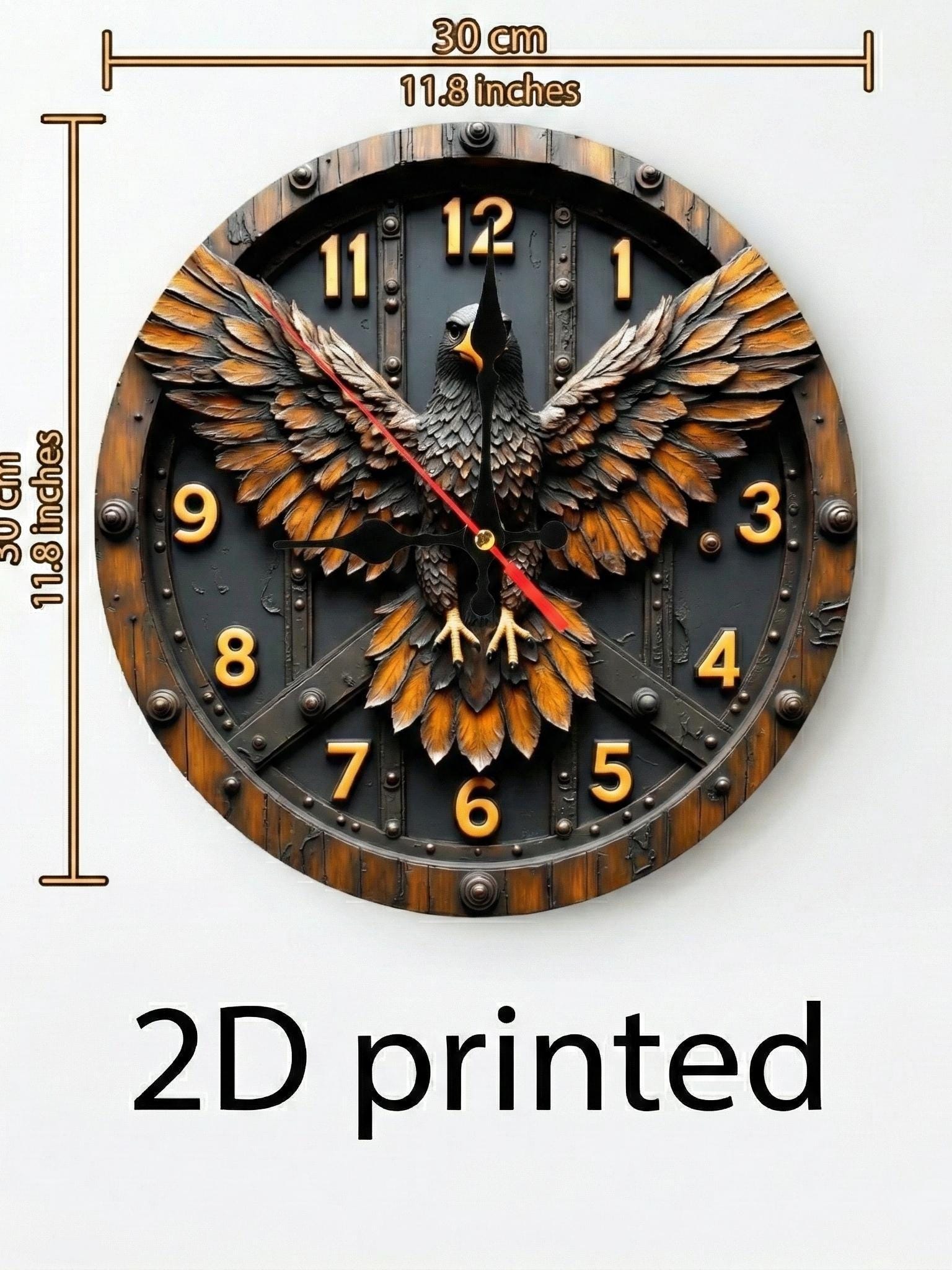 Enhance your space with this Eagle Wall Clock, featuring a bold 2D printed design that captures the majestic look of an eagle in flight. This decorative clock blends artistic detail with practical function, making it perfect for living rooms, offices, cabins, and rustic or nature-inspired interiors.