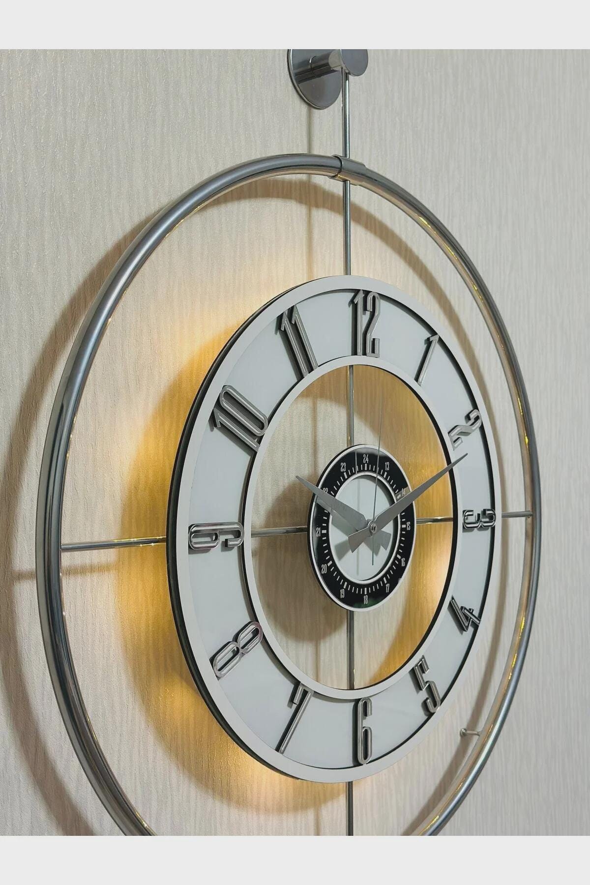 Elevate your living space with this large Modern Metal Wall Clock, designed in a sleek 60×80 cm format and crafted for contemporary interiors. The chrome powder–coated metal frame combined with tempered glass and integrated LED lighting creates a striking visual centerpiece for any modern home.